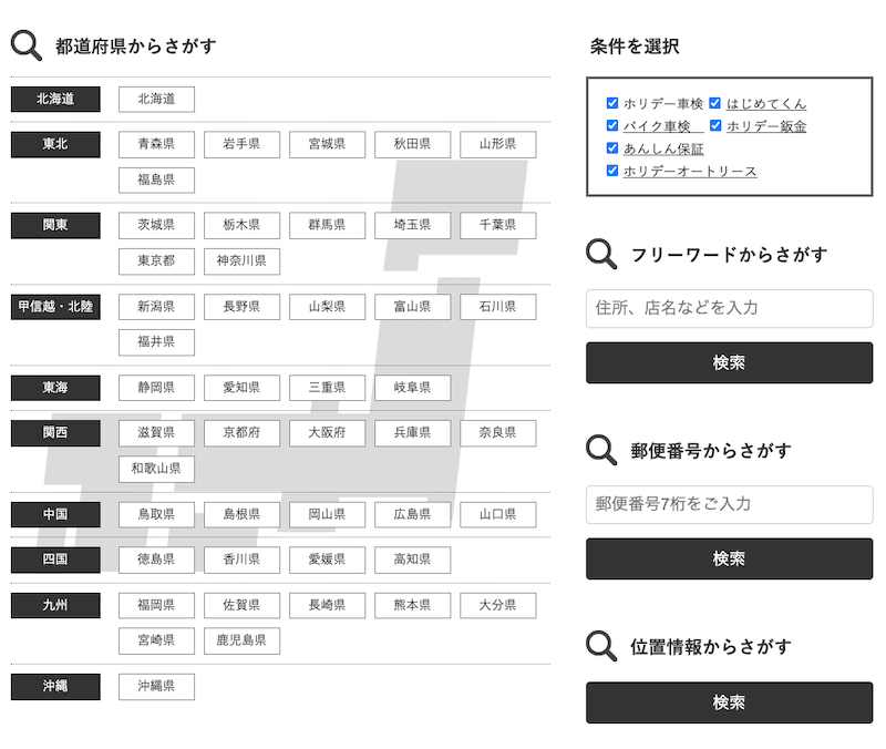 まずはご自宅の近くにホリデー車検の店舗があるかどうかをホリデー車検公式ページで検索します。