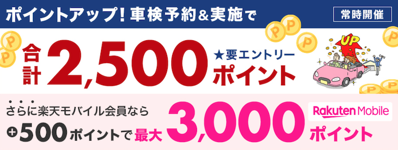 具体的には、楽天Car車検のキャンペーンでもらえるポイント数に500ポイントが加算される内容となっています。
